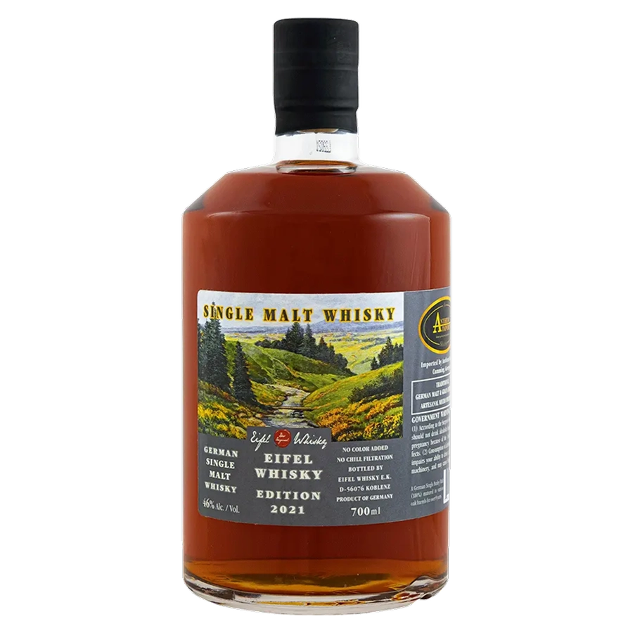 Eifel 2021 German Single Malt is no ordinary whisky! This 8-year-old expression, bottled at 46% ABV, comes from a small German distillery with a minimalist approach. It's matured in ex-Bordeaux American oak before a stint in 1st and 2nd fill cream sherry casks. Expect a complex flavor profile which includes malt and cereal notes, with a wallop of springtime florals, red fruits, sherry notes and subtle smokiness. The palate is caramel-forward with black pepper toffee, orchard fruits and fruitwood with a tannic backbone evolving to pleasant astringency balanced with sherry influence. The finish is sweet and lingering with caramel apples, vanilla and black pepper. It's a unique and rewarding dram that showcases the quality of German whisky.