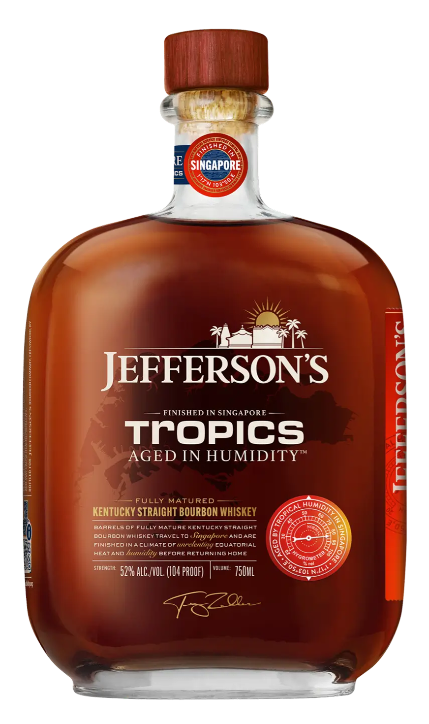 Jefferson's Tropics is a unique Kentucky bourbon aged in Singapore's tropical climate, resulting in a spirit with rich baking spices on the nose. Its palate offers sweet Bing cherry and creamy toffee notes, balanced by a hint of sea salt, culminating in a long, full-bodied finish. The intense heat and humidity of its aging environment contribute to its distinctive character.