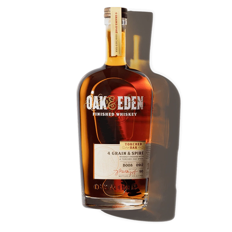 Oak and Eden's 4 Grain & Spire isn't your grandpa's bourbon. This one throws a curveball with a four-grain mash bill – corn, rye, wheat, and malted barley – creating a complex base. It's aged in new American oak, delivering that classic bourbon depth. But the real twist? A toasted American oak spire is added to the bottle, imparting a creamy texture and extra layers of flavor. Think caramel, ginger, and allspice, rounded out by candied fruit, vanilla, and a hint of orange spice. It's a bold, sweet, and subtly spicy whiskey that rethinks tradition.
