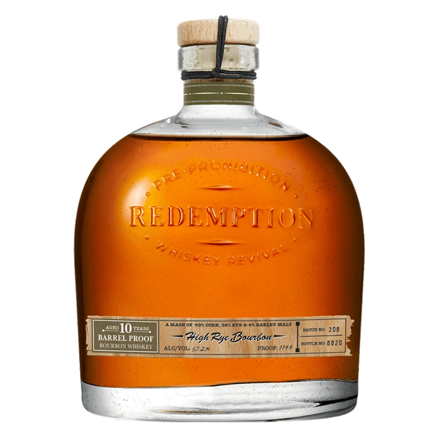 Redemption 10 Year Barrel Proof Rye is a tawny-hued MGP rye that delivers a potent punch. Aged a full decade and bottled at barrel proof, it explodes with notes of whipped honey, butterscotch, and a spicy black pepper kick. Aromatic herbs like dill and sage mingle with a unique organic strawberry note on the nose. The palate is a complex blend of toasted rye bread, honeyed sweetness, and warm spices like nutmeg and cinnamon, grounded by charred oak and a savory cherry hint. It finishes long with seasoned oak, caramel, and a lingering rye spice, balanced by a touch of strawberry vanilla, making it a truly memorable and enjoyable sip.