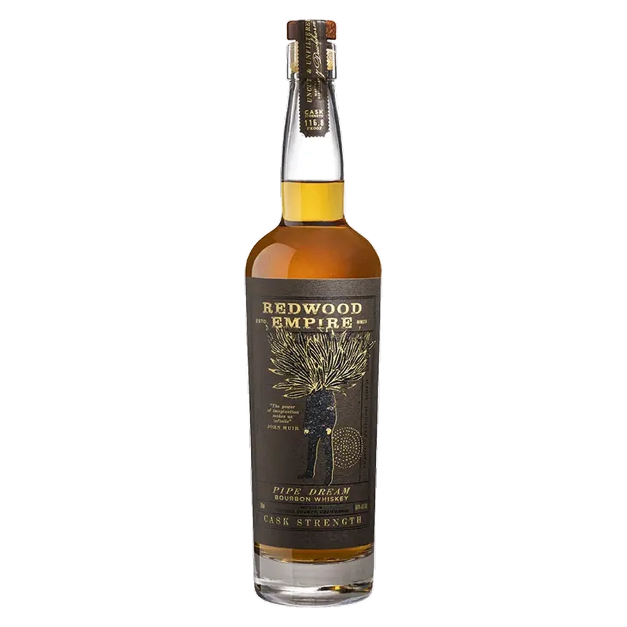 Redwood Empire's Pipe Dream Cask Strength is a Northern California bourbon experience, bottled uncut and unfiltered. Aged at least four years near the coast, this limited edition packs a punch at 115.8 proof. Expect a deep golden hue and a nose full of toffee, cherry, and soft leather notes, hinting at the orchard-filled surroundings of the distillery. The palate brings cherry cola, honeyed sweetness, butterscotch richness, and a nutty pecan finish. Made from a mash bill of corn, rye, malted barley, and wheat, this bourbon is a complex and flavorful pour that showcases the Redwood Empire's craft.