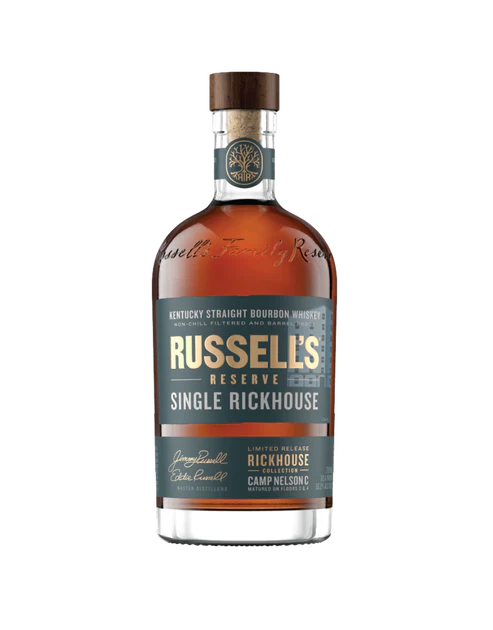 Russell's Reserve Single Rickhouse 2022 - Camp Nelson C is a remarkable bourbon that delights the senses with its rich, decadent flavor profile. Crafted from a small batch of just 72 barrels, this non-chill filtered whiskey boasts a robust 112.4 proof. On the nose, enticing aromas of lightly toasted caramel, nutty English toffee, and rickhouse oak tantalize the senses. Upon tasting, a harmonious blend of flavors unfolds, with notes of dark chocolate, nutmeg, savory orange peel, and leather intermingling with vanilla bean, brown sugar, and sweet charred oak. Hints of savory grape, almost red-wine-esque, mingle with maple syrup and warm baking spices, leading to a long, robust finish where craft cream soda, buttery molasses, baked cinnamon, singed cherry skins, cola, clove, and a faint blood orange linger delightfully. This exceptional bourbon captures the essence of its roots, offering a truly unique and unforgettable sipping experience.