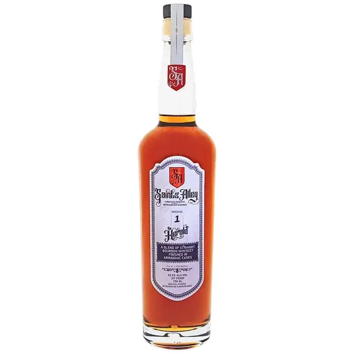 Meet Saints Alley The Herald, a standout whiskey created through a unique collaboration between Ironroot Republic and The Liquorhound. This bottle brings together two distinct bourbons: a spicy high-rye kind and Ironroot's signature heirloom corn spirit. The real magic happens with a finishing period in French Armagnac casks, which infuses the whiskey with deep stone fruit, rich mahogany, and a touch of elegance. Expect a creamy feel on the palate, with notes hinting at things like citrus peel, sweet dates, warm vanilla, and gentle spice, all balanced by that French oak influence. Bottled at 100 proof without chill filtration or added color, it's a complex, limited release that offers a fascinating blend of bourbon character and Armagnac depth.